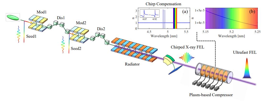 近日,大连化学物理研究所化学反应动力学全国重点实验室大连光源科学研究室张未卿研究员团队与深圳先进光源研究院科研团队合作,在超快软X射线自由电子激光(FEL)领域取得新进展。研发团队提出一种基于等离子体的高效啁啾脉冲压缩方法,从理论和模拟层面证明了该方法可突破传统技术的效率瓶颈,为实现超高亮度的软X射线激光超短脉冲输出提供了新路径。