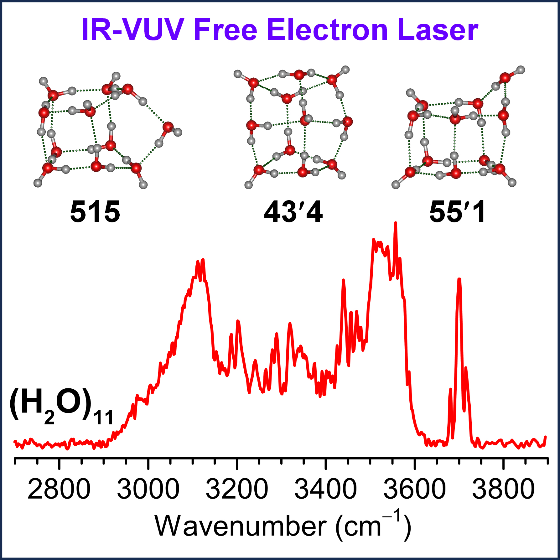 近日,大连化学物理研究所化学反应动力学全国重点实验室团簇光谱与动力学研究组(2506组)江凌研究员、李刚副研究员实验团队联合清华大学李隽院士理论团队,利用自主研制的基于大连相干光源的中性团簇红外光谱实验站,表征了水分子十一聚体团簇的三种结构模型(515、43′4和55′1),为理解水的复杂氢键网络结构演化机制提供了新的科学依据。